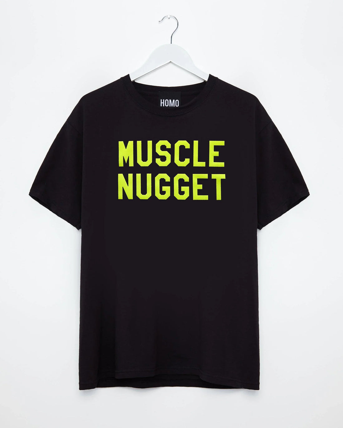 Fluorescent yellow flock muscle nugget - black tshirt