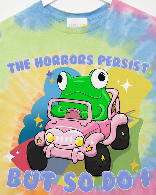 The horrors persist, but so do I, on tie-dye tshirt / crop top