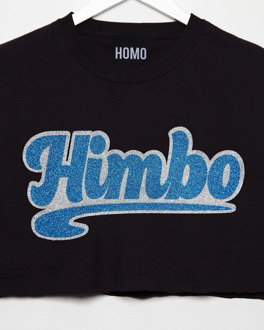 Himbo, blue/silver glitter on black - mens sleeveless crop top.