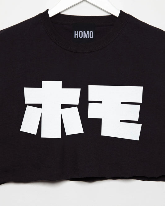 HOMO in Japanese, white on black - mens sleeveless crop top.