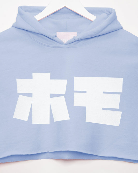 HOMO in Japanese, white on light blue - mens hoodie crop top.