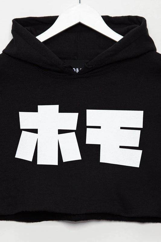 HOMO in Japanese, mens hoodie crop top - White on Black.