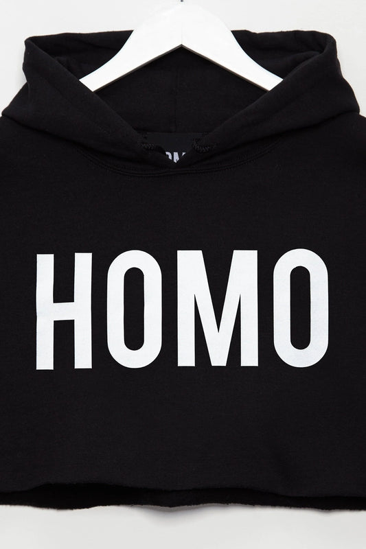 HOMO mens hoodie crop top - White on Black.