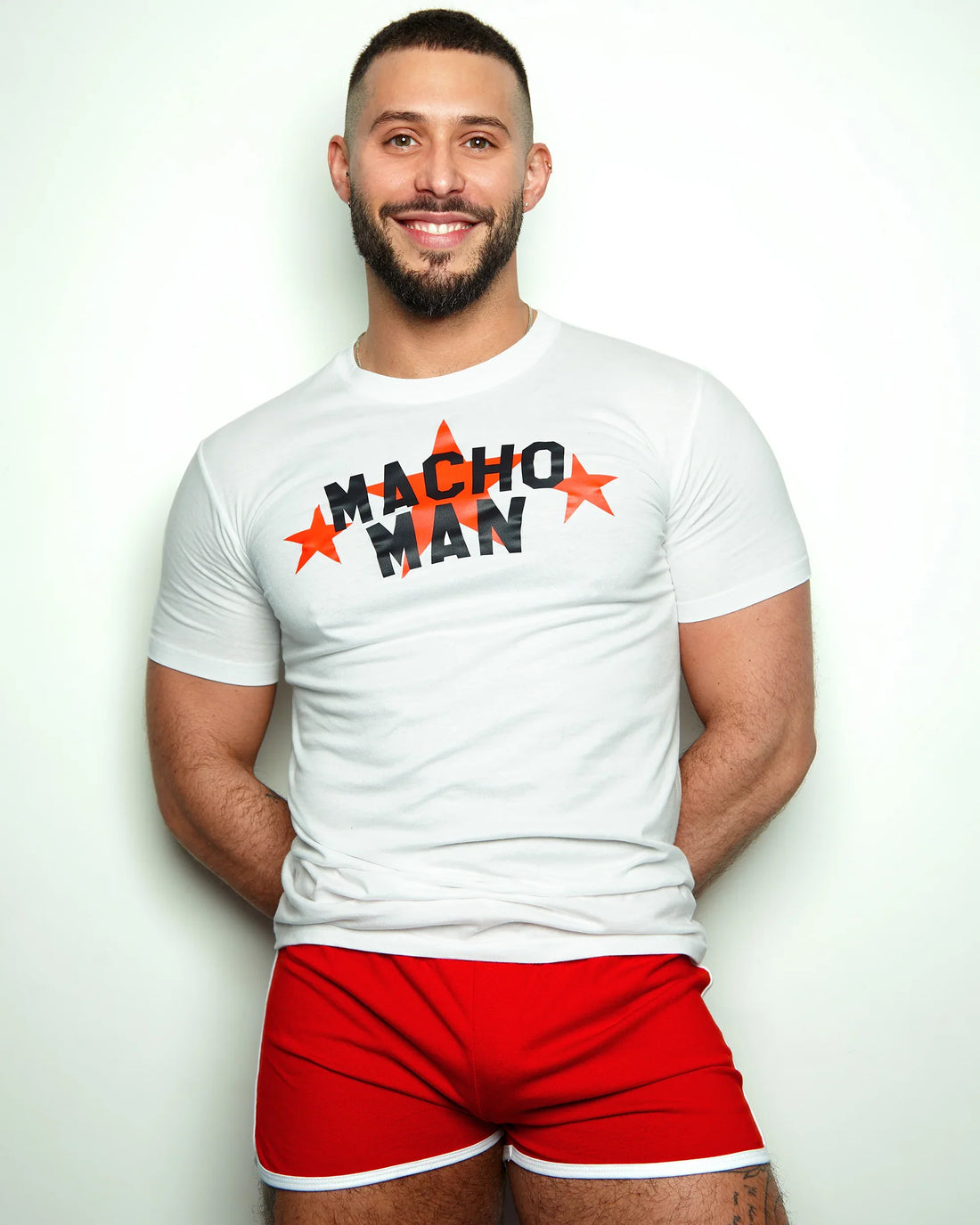 Slogan tee: Macho man on white tshirt