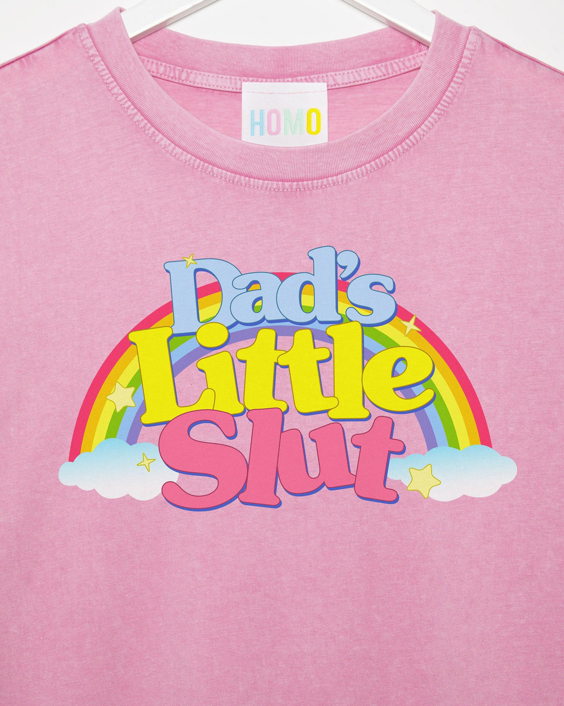 Fluorescent pink HOMO on blue crop top