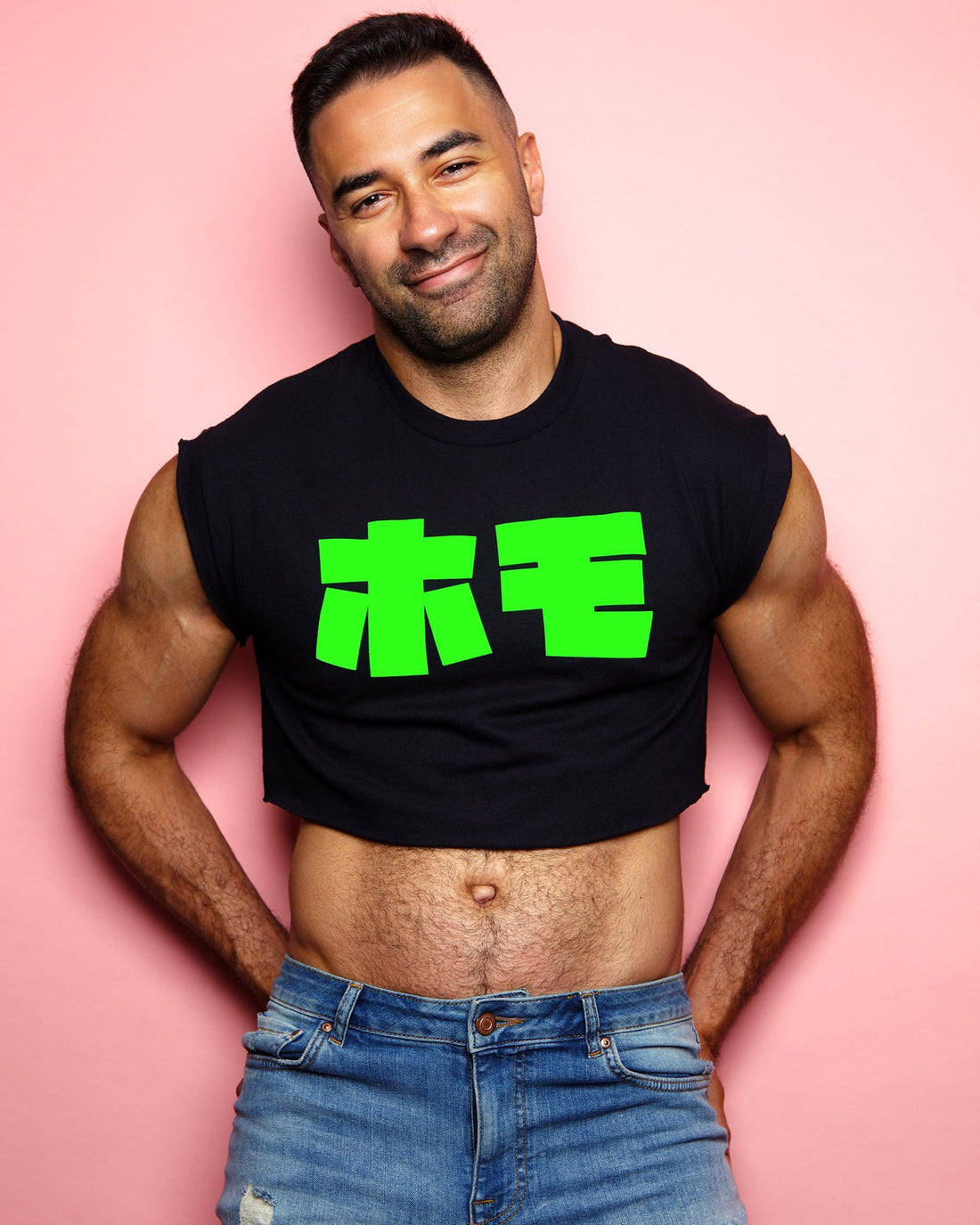 Fluorescent green flock HOMO in Japanese - Black crop top