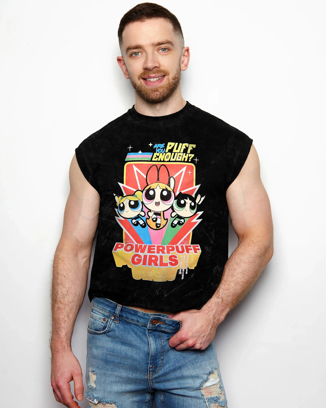 Official Powerpuff Girls, sleeveless low cut crop top - distressed black