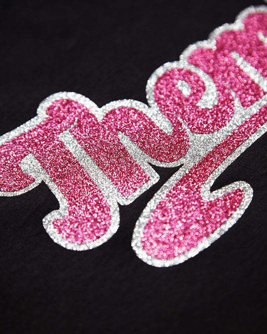 Thembo, pink/silver glitter on black - mens sleeveless crop top.