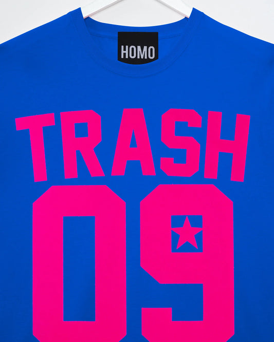 Sports jersey TRASH 09 - fluorescent pink flock on blue sleeveless tshirt