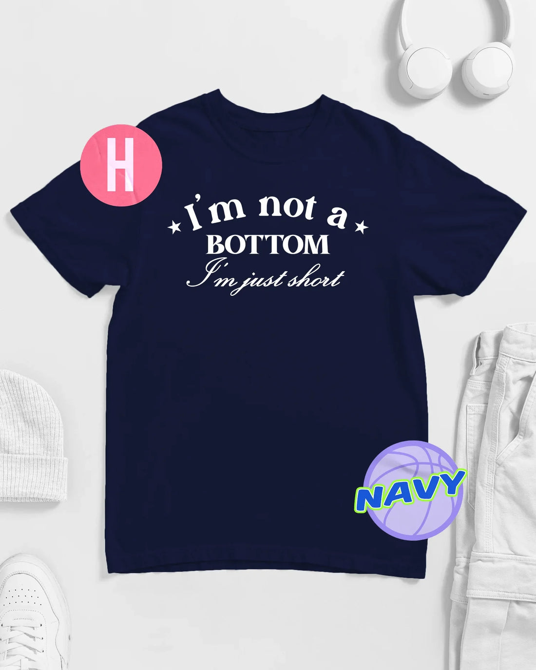 I'M NOT A BOTTOM, I'M JUST SHORT slogan on navy - tee