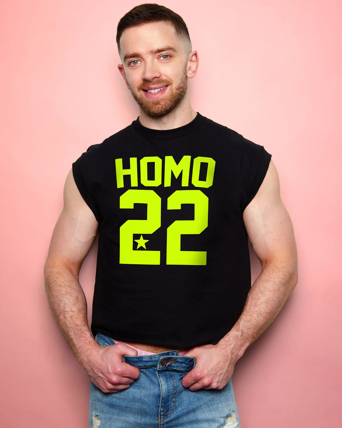 Sports jersey HOMO 22 - fluorescent yellow flock on black sleeveless cropped tshirt