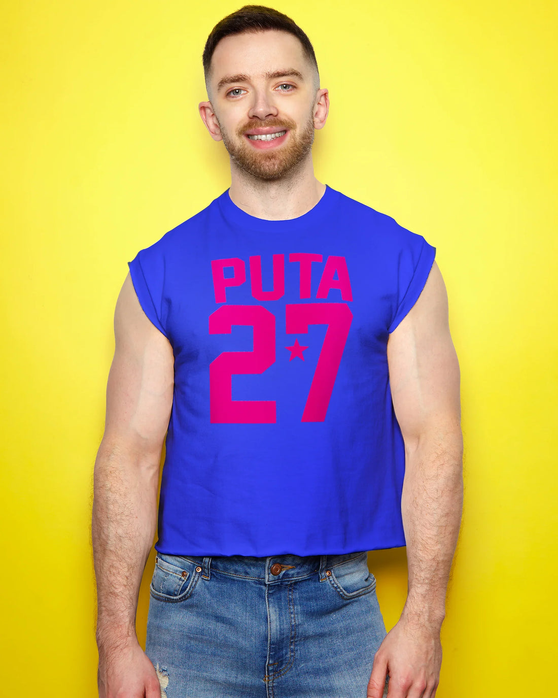 Sports jersey PUTA 27 - fluorescent pink flock on blue sleeveless cropped tshirt