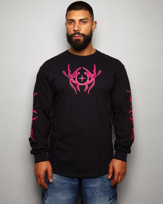 NXS011: Metallic pink style print on black oversized pullover hoodie.