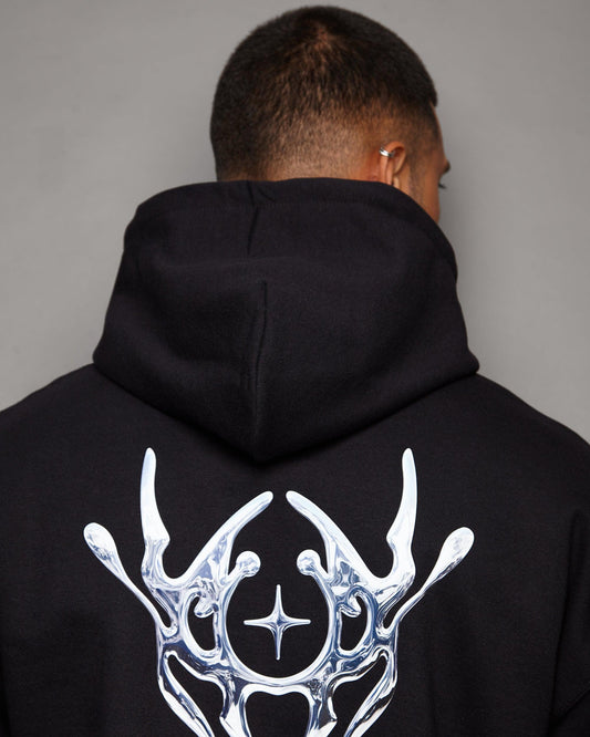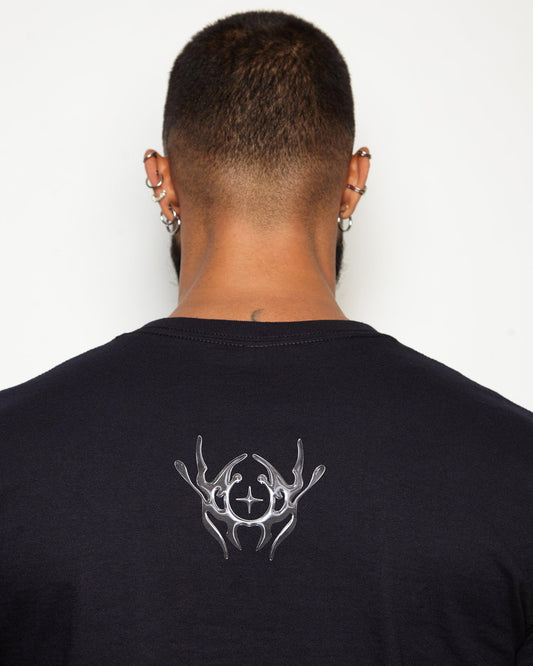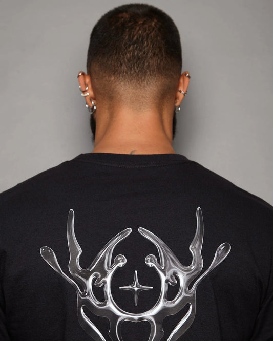 NXS001: Gunmetal style print on black heavy weight oversized tee.