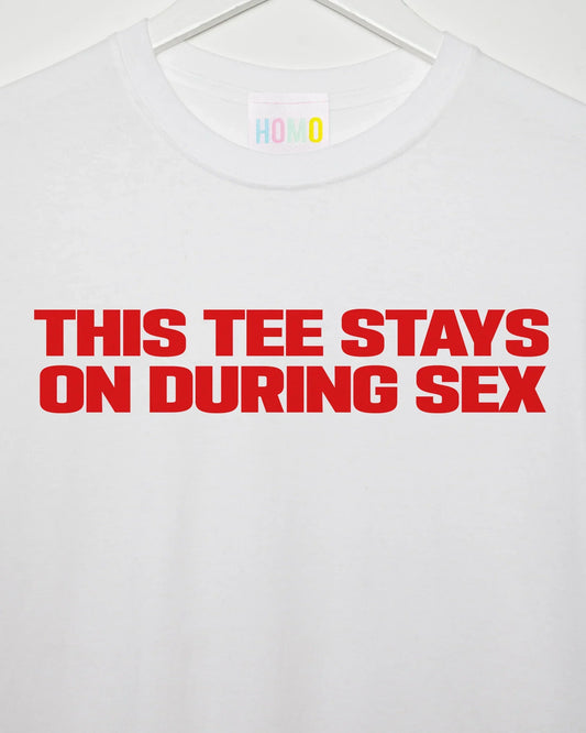 Slogan tee: This t-shirt stays on, red print on white t-shirt