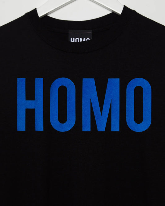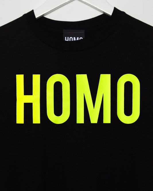 HOMO Logo, fluorescent yellow flock on black tshirt