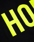 HOMO Logo, fluorescent yellow flock on black tshirt