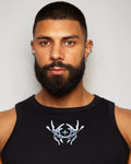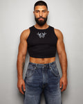 This garment features a silver style print on a black micro rib muscle crop tank.