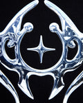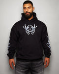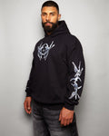 This garment features a metallic silver style front and arm print on an oversized black pullover hoodie. With super soft feel inner fleece and the plush fabric.