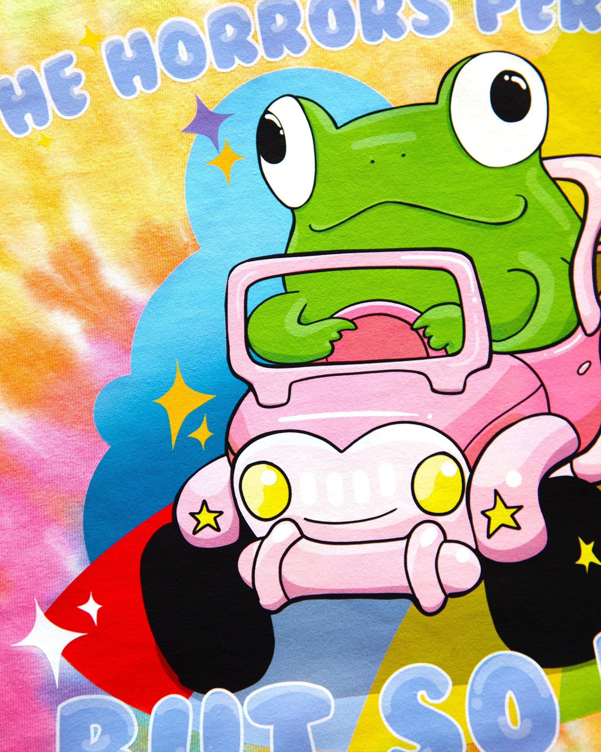 Beep beep! Make way for Terrence the frog! The horrors persist, but so does he! Riding in is barbie pink jeep along a rainbow road made of nightmares.  Favourite colour black.