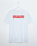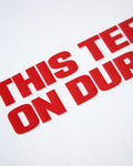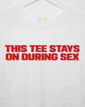 This t-shirt stays on, red print on white - tshirt