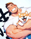 Adorable hunk with his pet Shiba Inu wrapped up in his arms. Japanese style text beside him. The text is inspired by Japanese calligraphy but has no meaning.