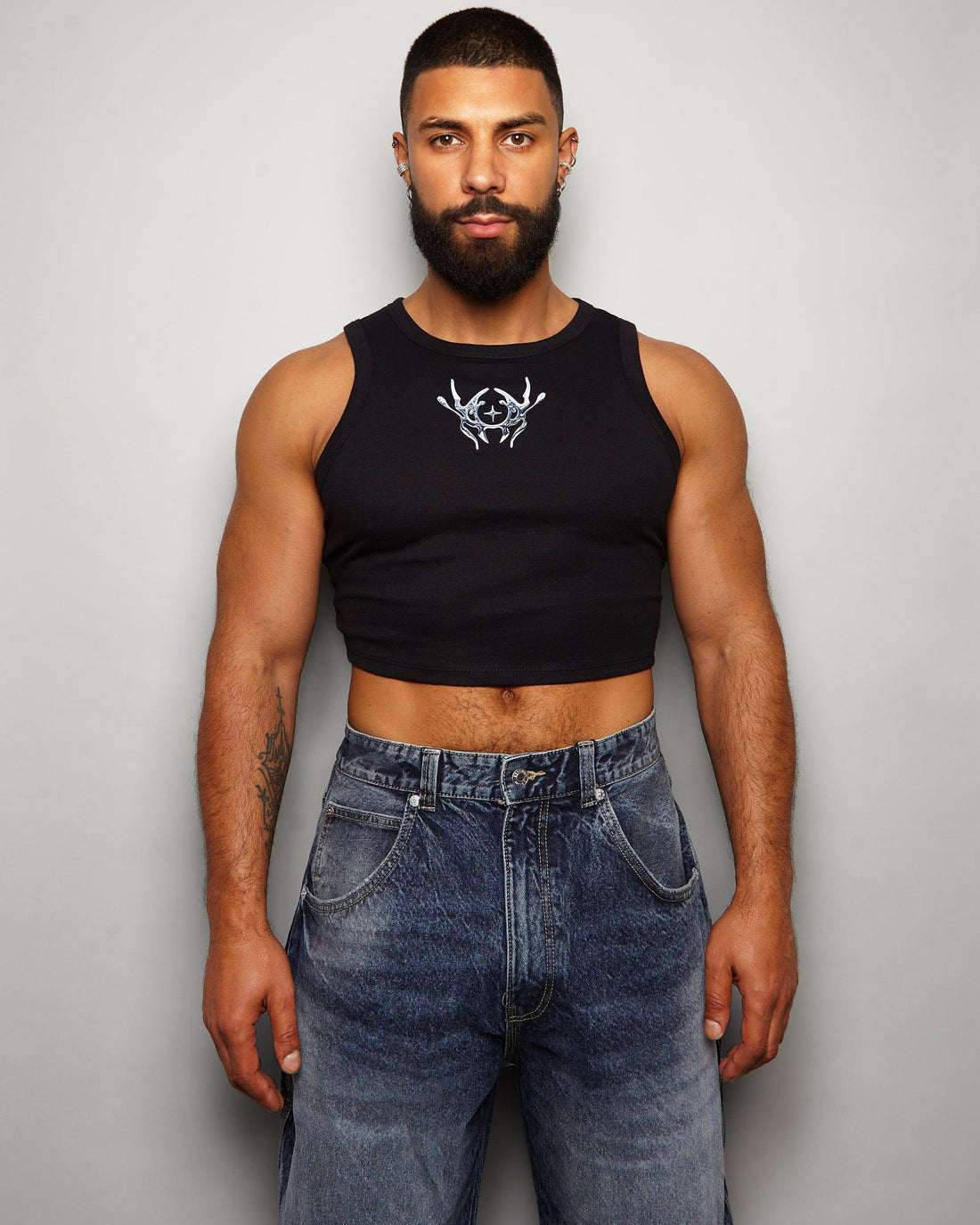 NXS015: Silver style print on black micro rib muscle crop tank