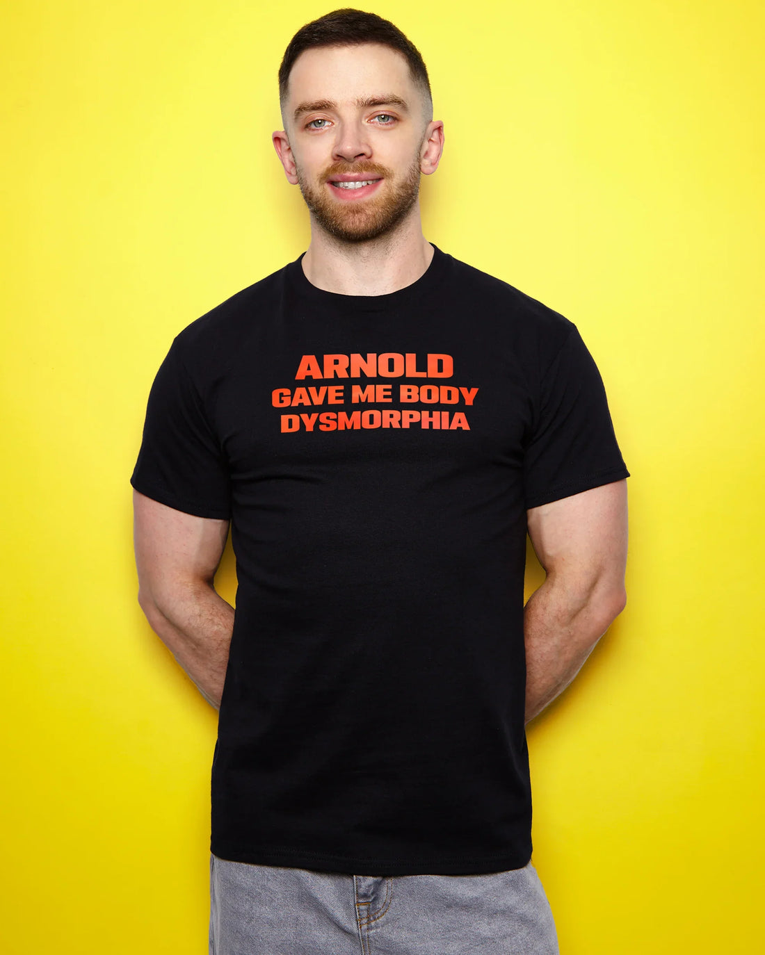 MEDIUM - Arnold gave me body dysmorphia, red print on black - tshirt