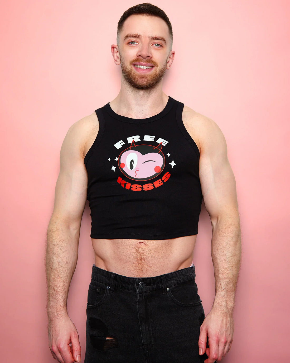 LARGE - Devilish, Free kisses on black - low cut tank crop