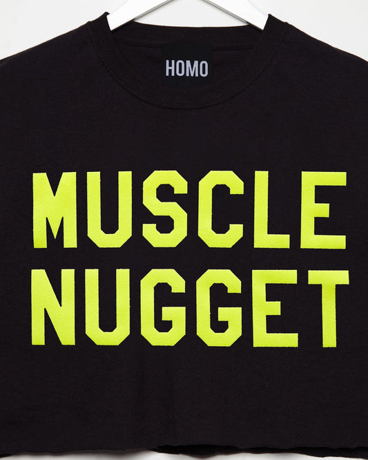 Fluorescent yellow flock muscle nugget - black cropped tee / crop top