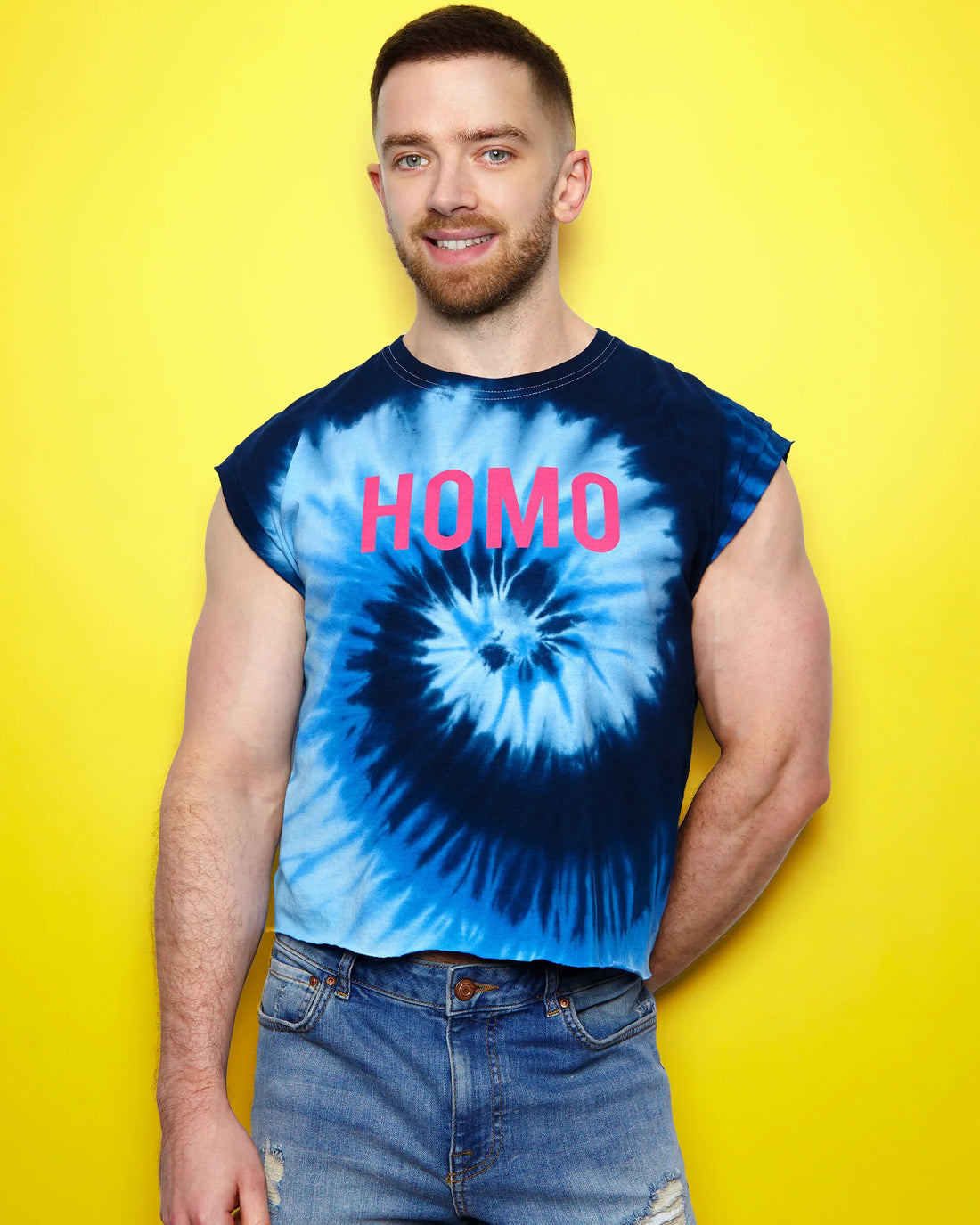 Pink flock HOMO on blue tie-dye - low cut crop top
