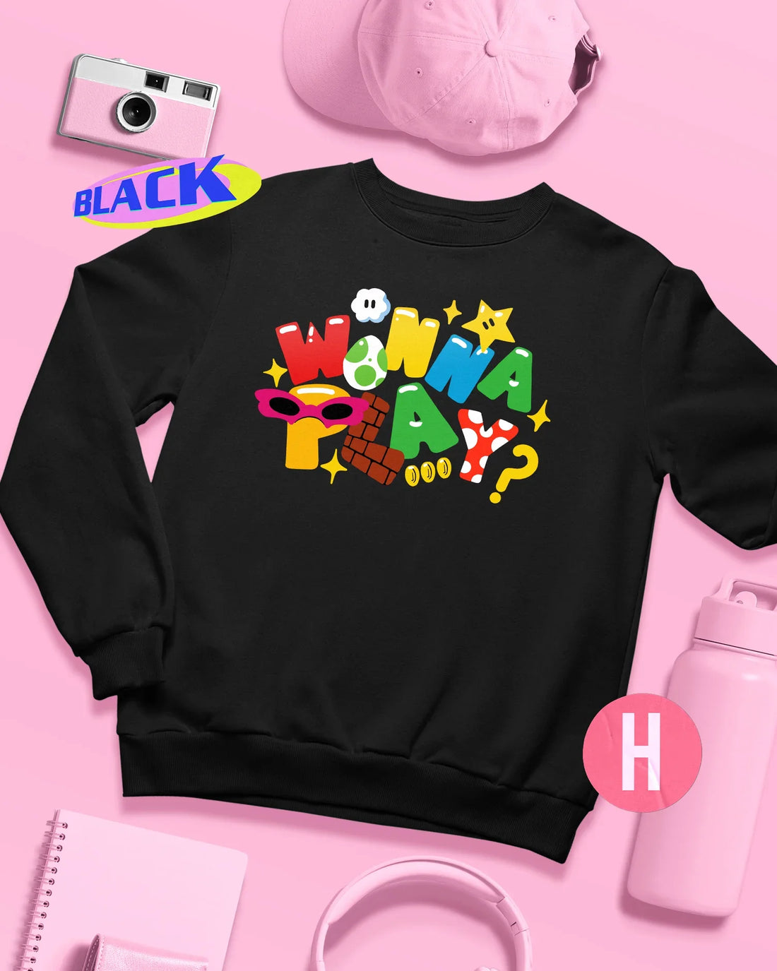 Retro video game inspired "Wanna Play" slogan soft style sweatshirt - Black