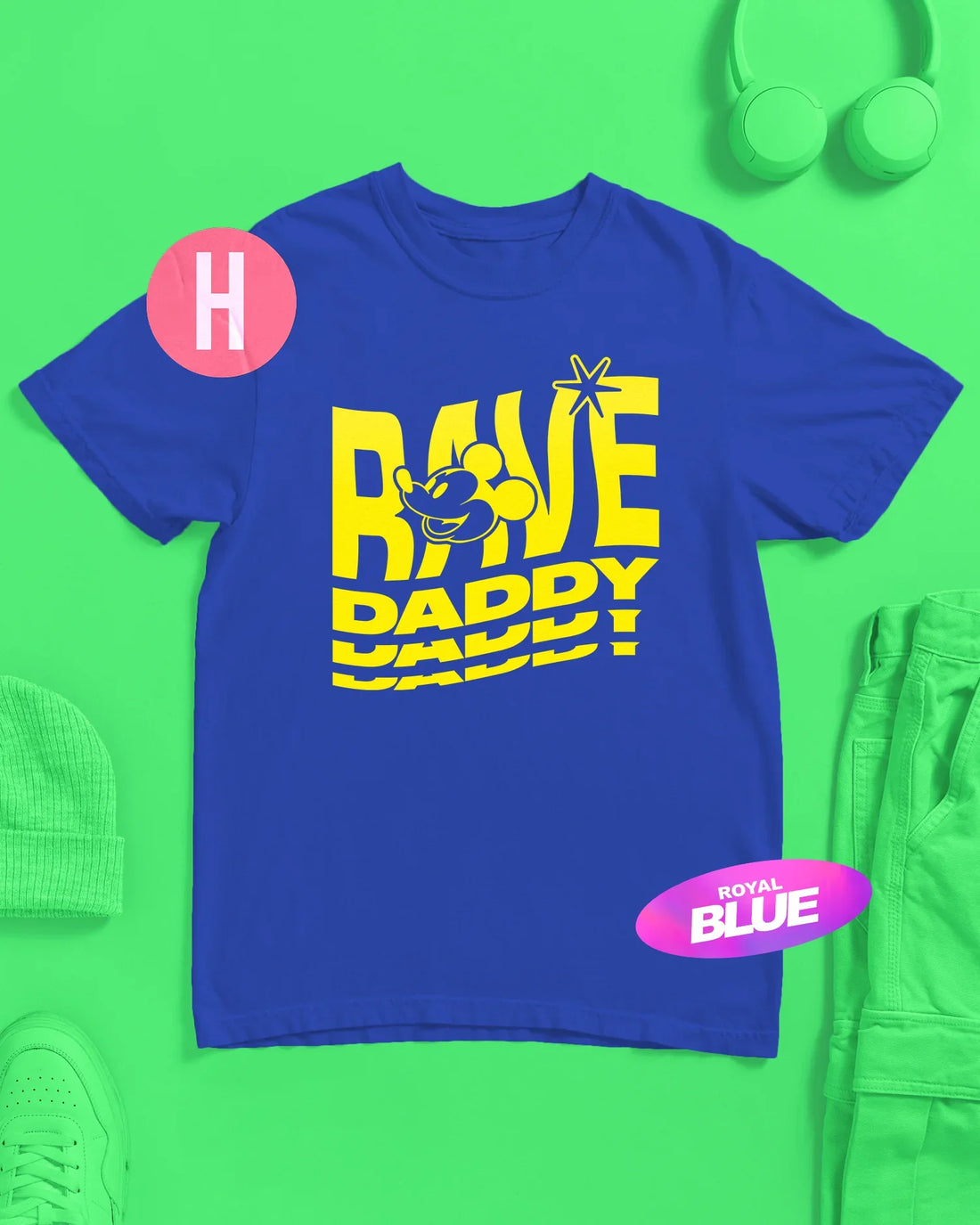 Rave daddy slogan, fluorescent yellow flock on blue - tee