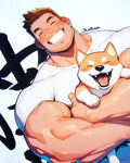 Adorable hunk with his pet Shiba Inu wrapped up in his arms. Japanese style text beside him. The text is inspired but Japanese calligraphy but has no meaning.