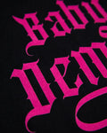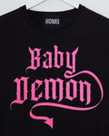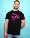 Baby Demon, pink flock on on black tshirt