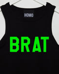 Get ready for a brat summer 2.0 in this fluorescent green flock text on black crop top. FYI: Only brats wear HOMO! The perfect gay tank top crop top you see all the hot guy's on IG wear.