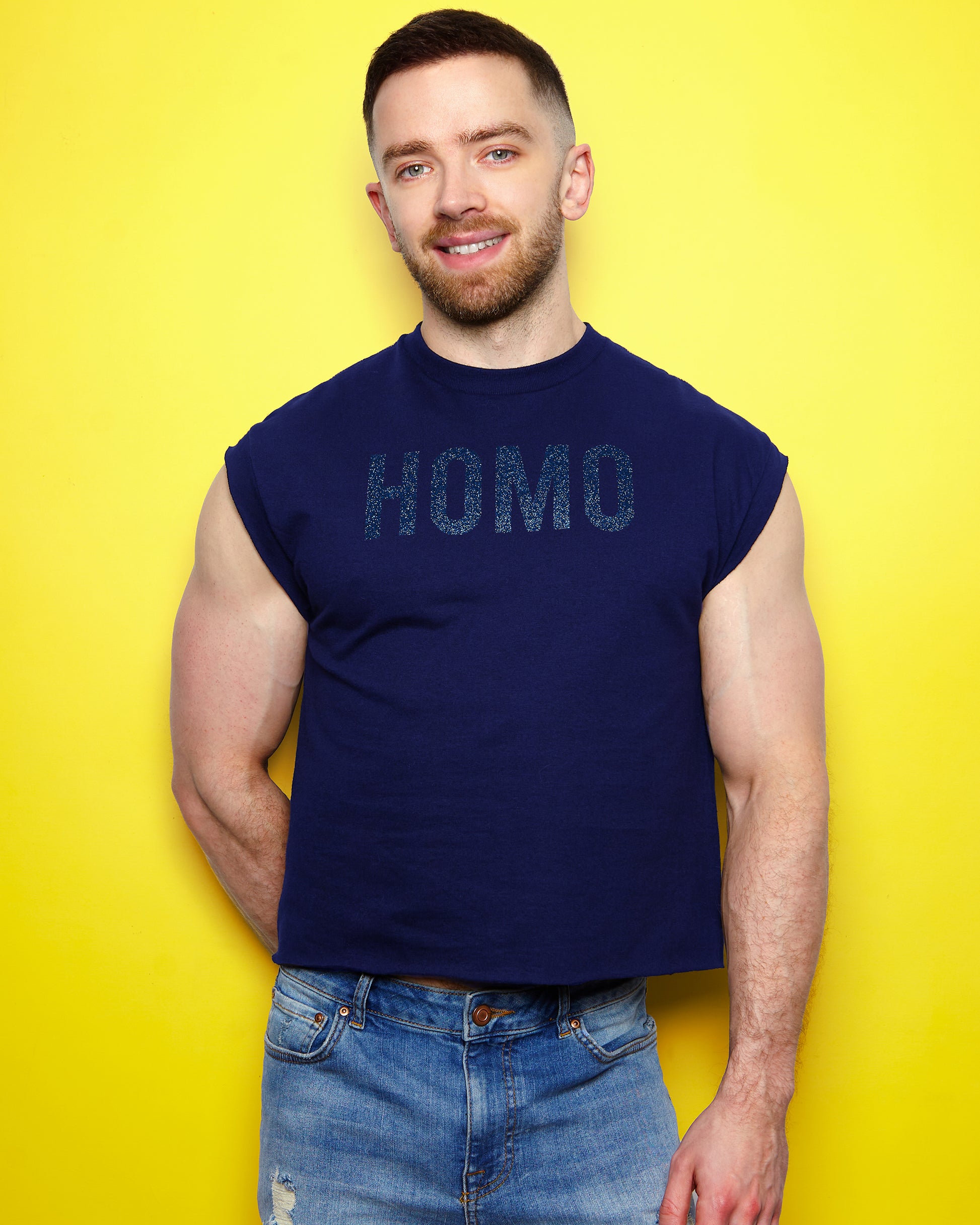 HOMO Logo, navy glitter print on navy - low cut cropped tee