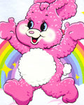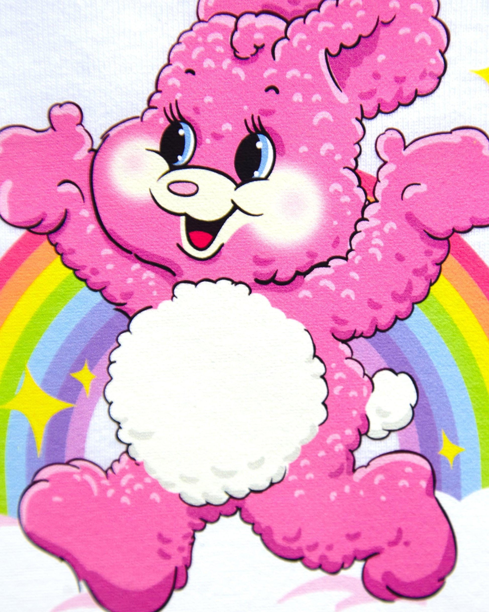 Adorable bunny with rainbow and sparkles on ribbed crop top with seams.