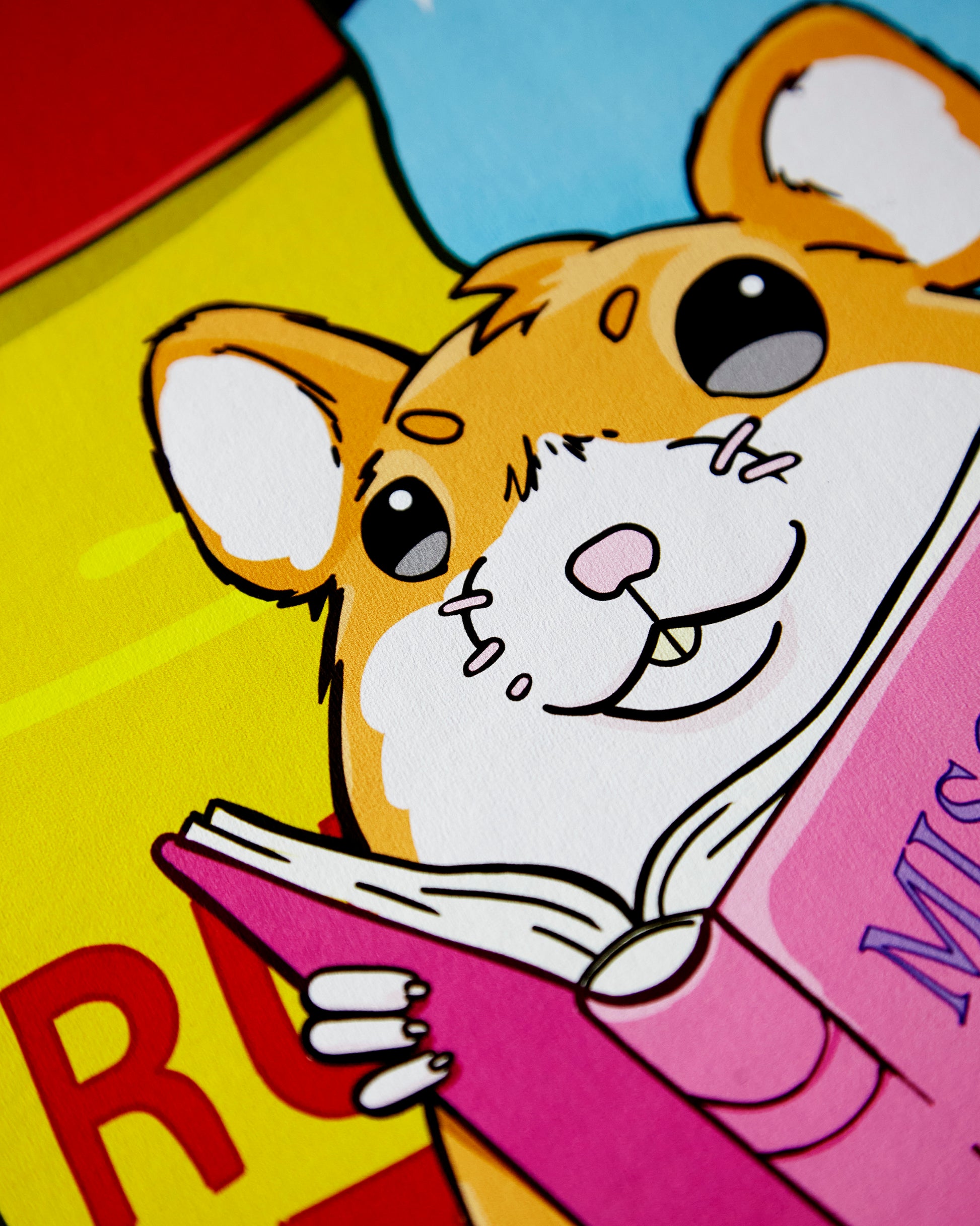 This mischievous hamster holds a book saying "Mischief 101" on black.