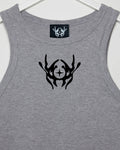 This garment features a black print on a white sports grey rib muscle low cut crop tank.
