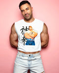 MEDIUM - Jojo Bear: Hunky Hank with his Shiba Inu on white - sleeveless low cut crop top