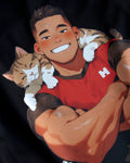Adorable hunk with his pet kitten laying on his shoulders. Japanese style text. The text is inspired but Japanese calligraphy but has no meaning.