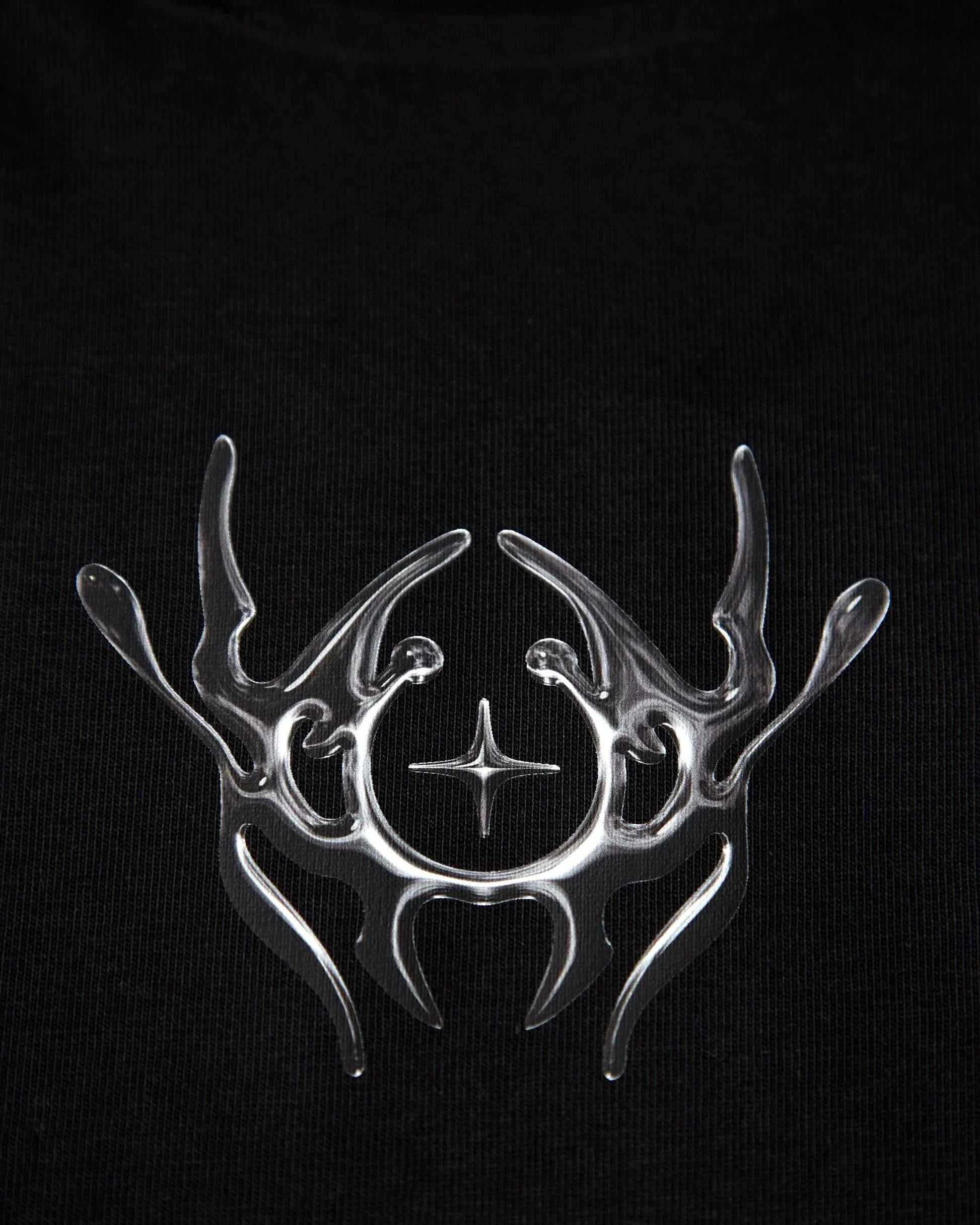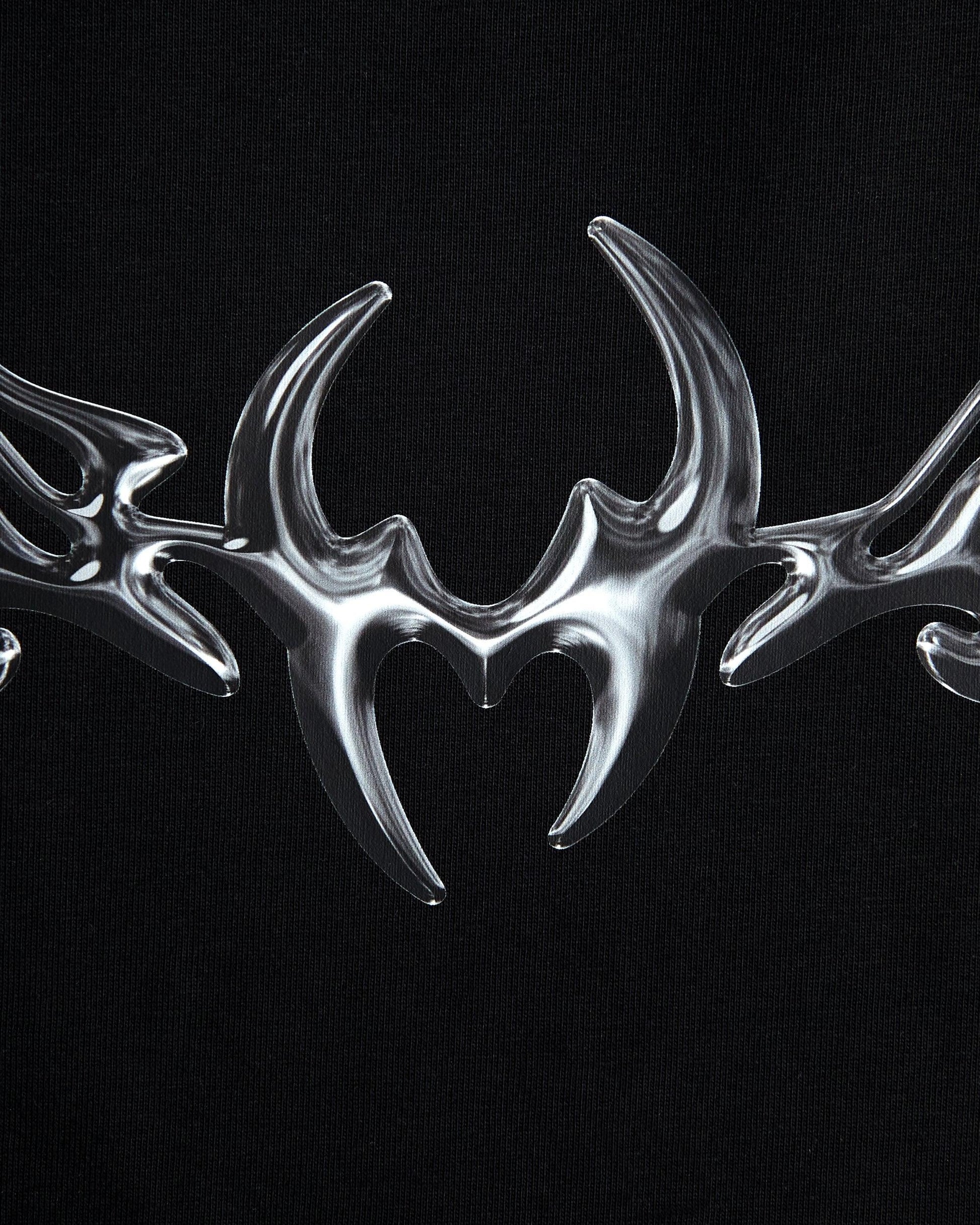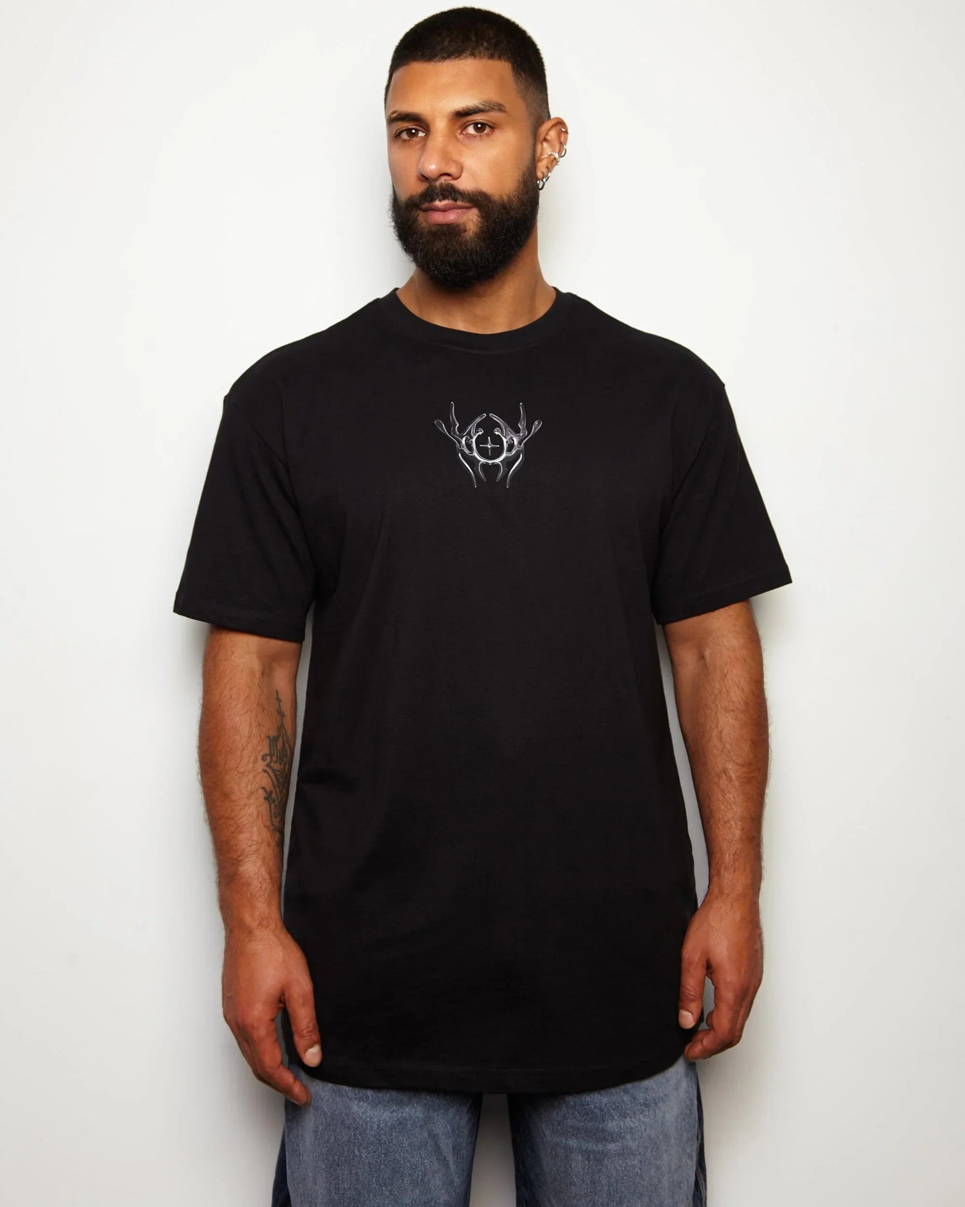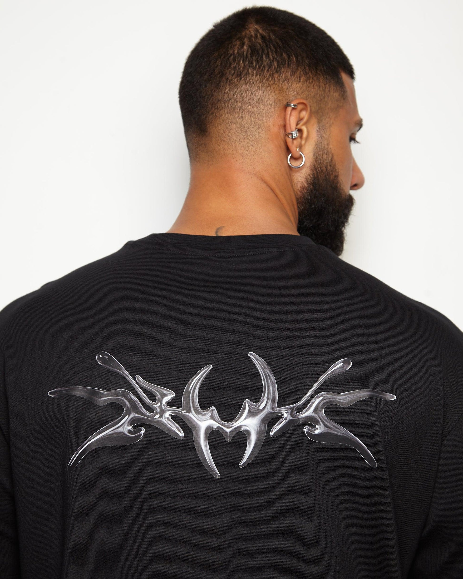 This garment features a gunmetal style front and back print on an heavy weight oversized fit black tee.