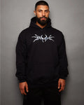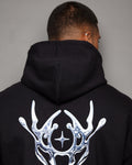 This garment features a metallic silver style front and back print on an oversized black pullover hoodie. With super soft feel inner fleece and the plush fabric.
