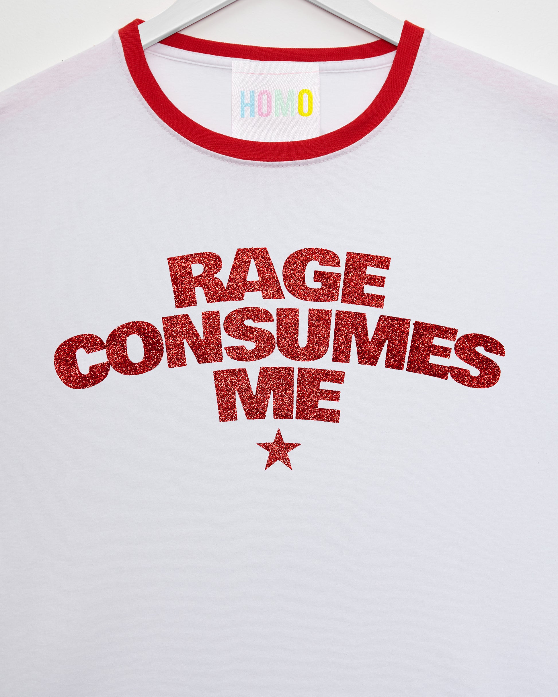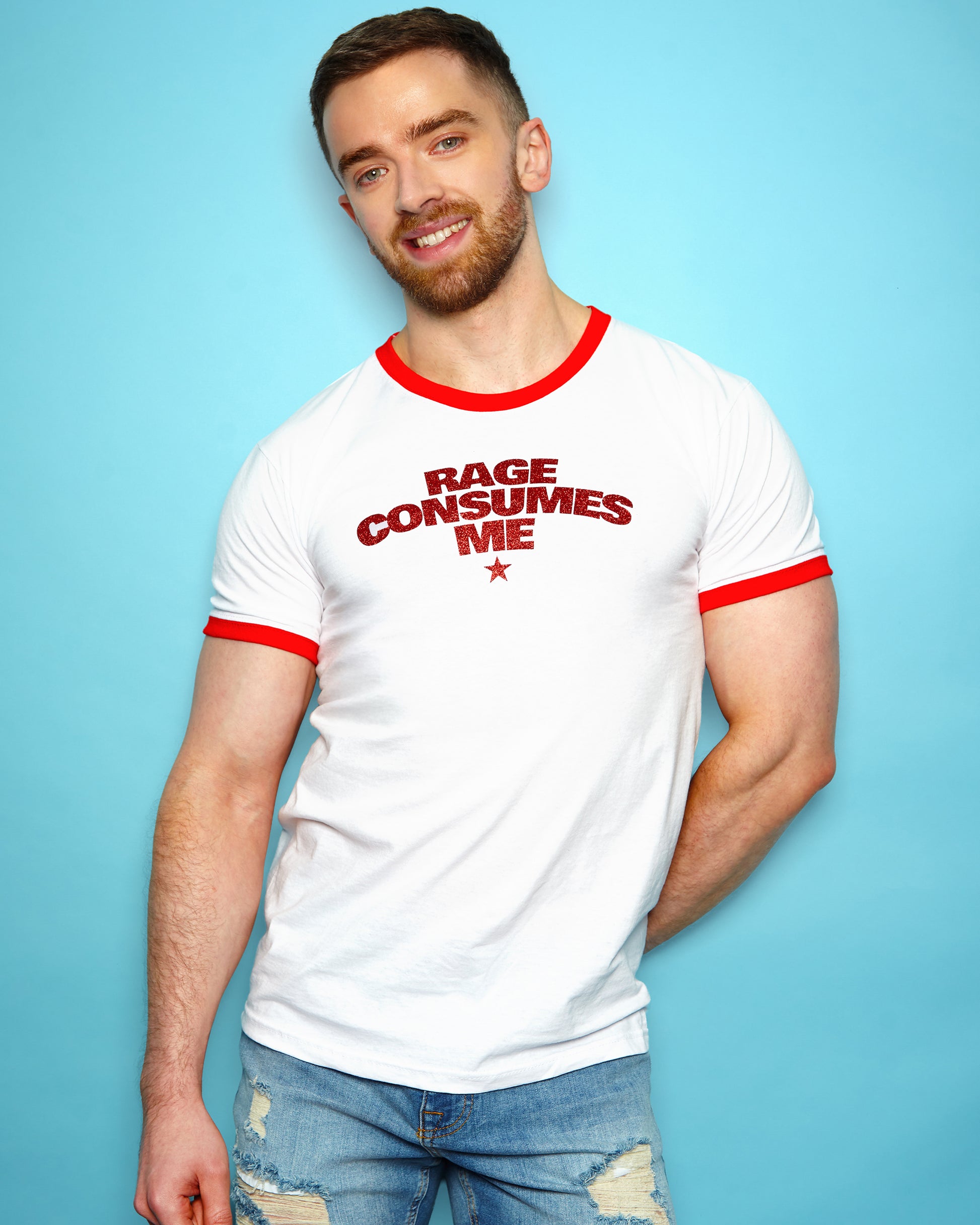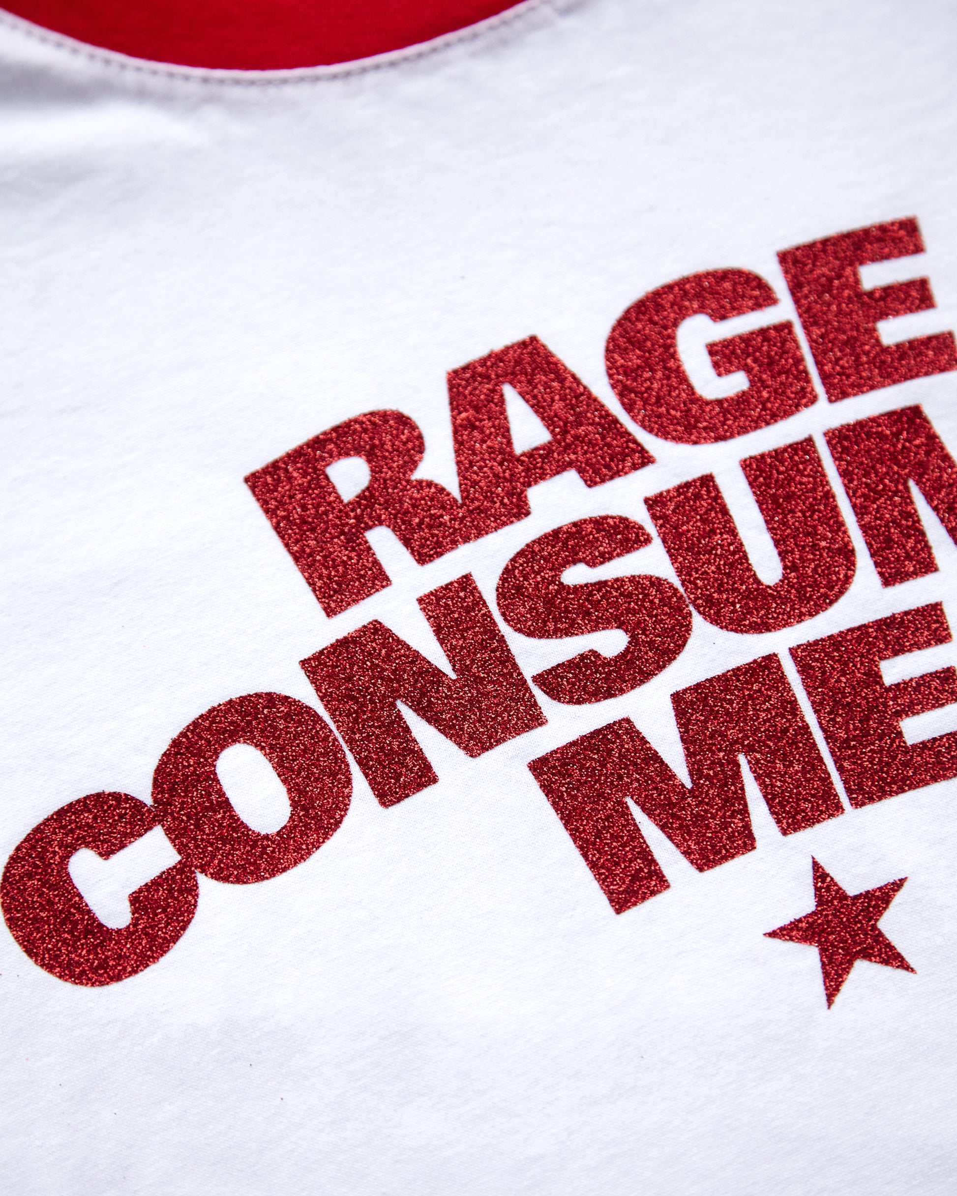Rage consumes me, red glitter on red trim ringer t-shirt.