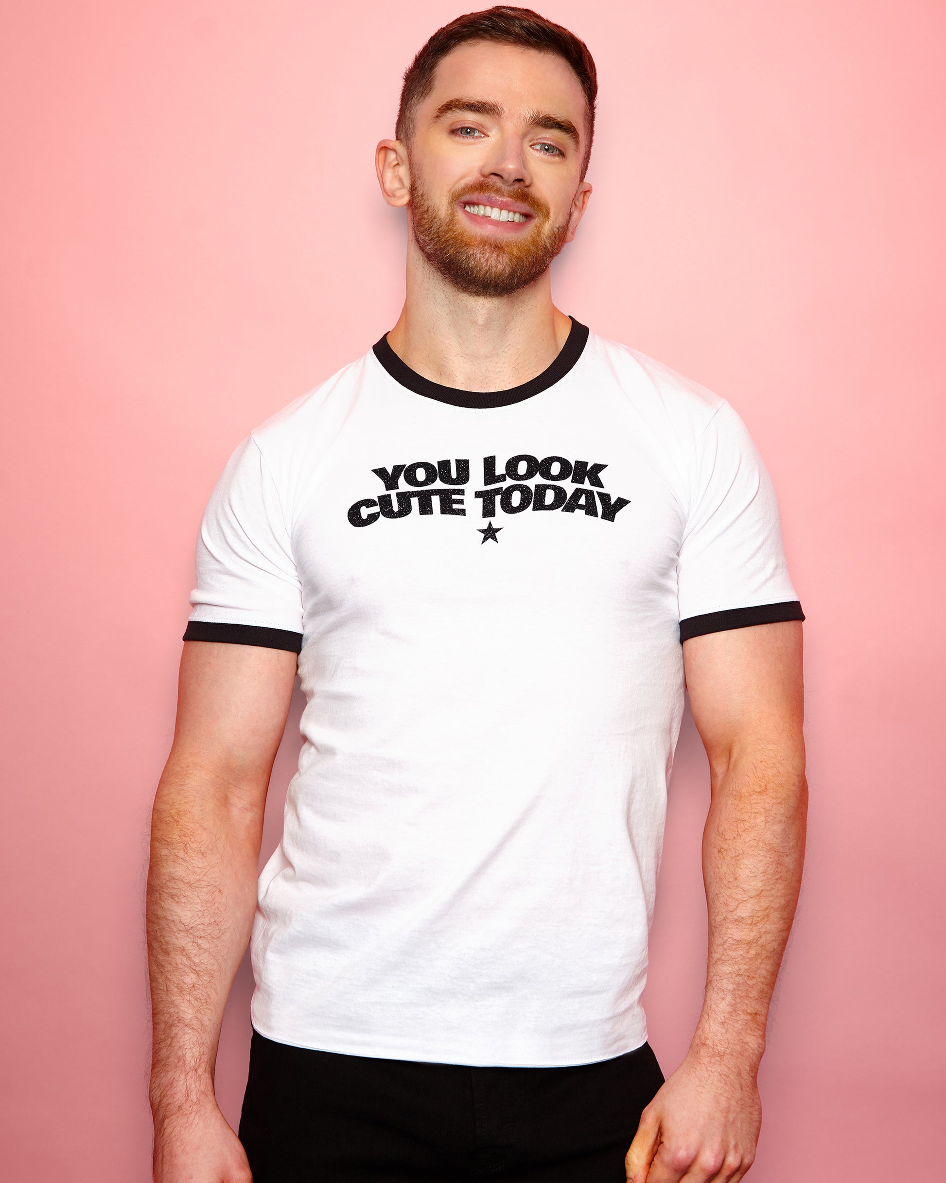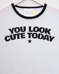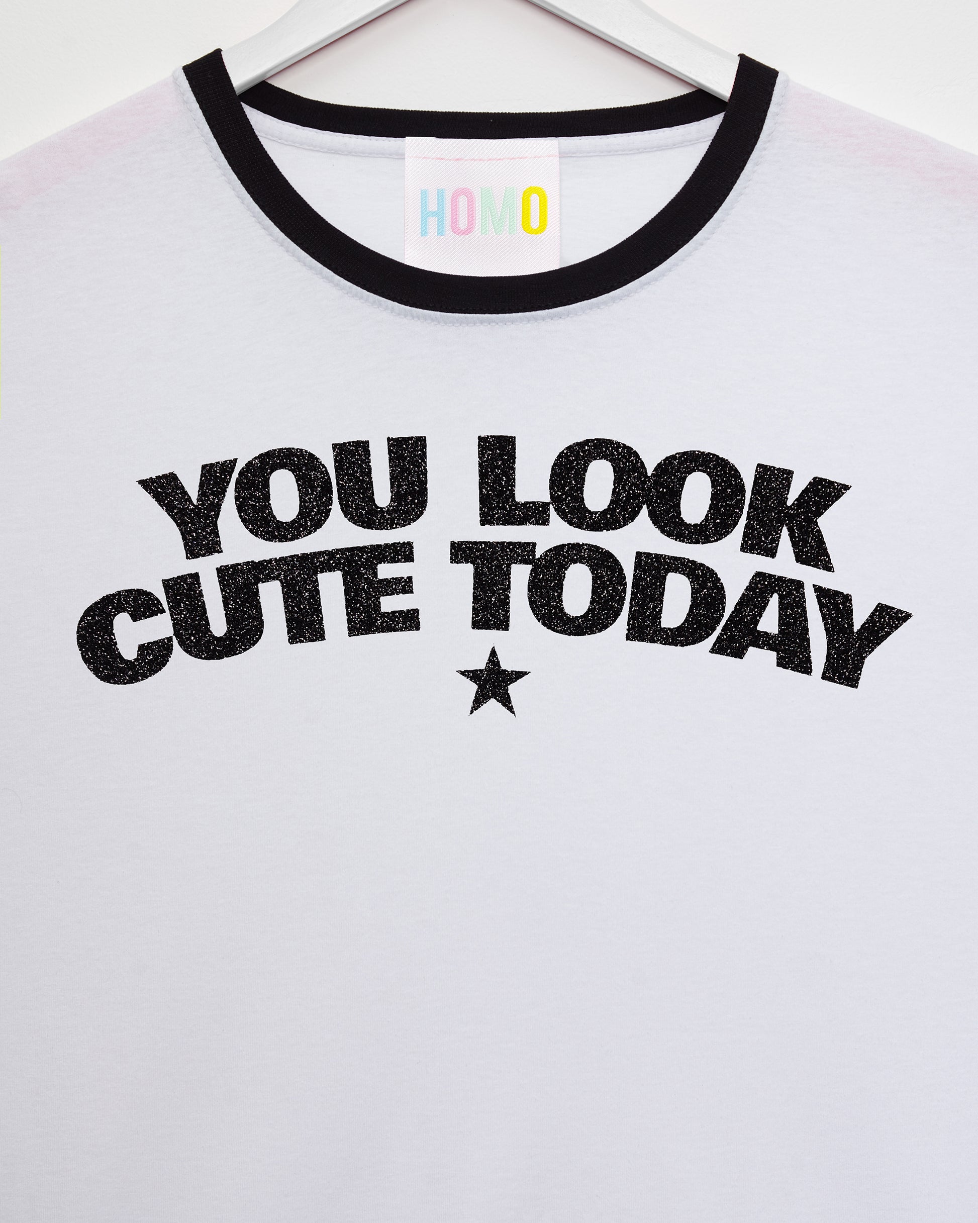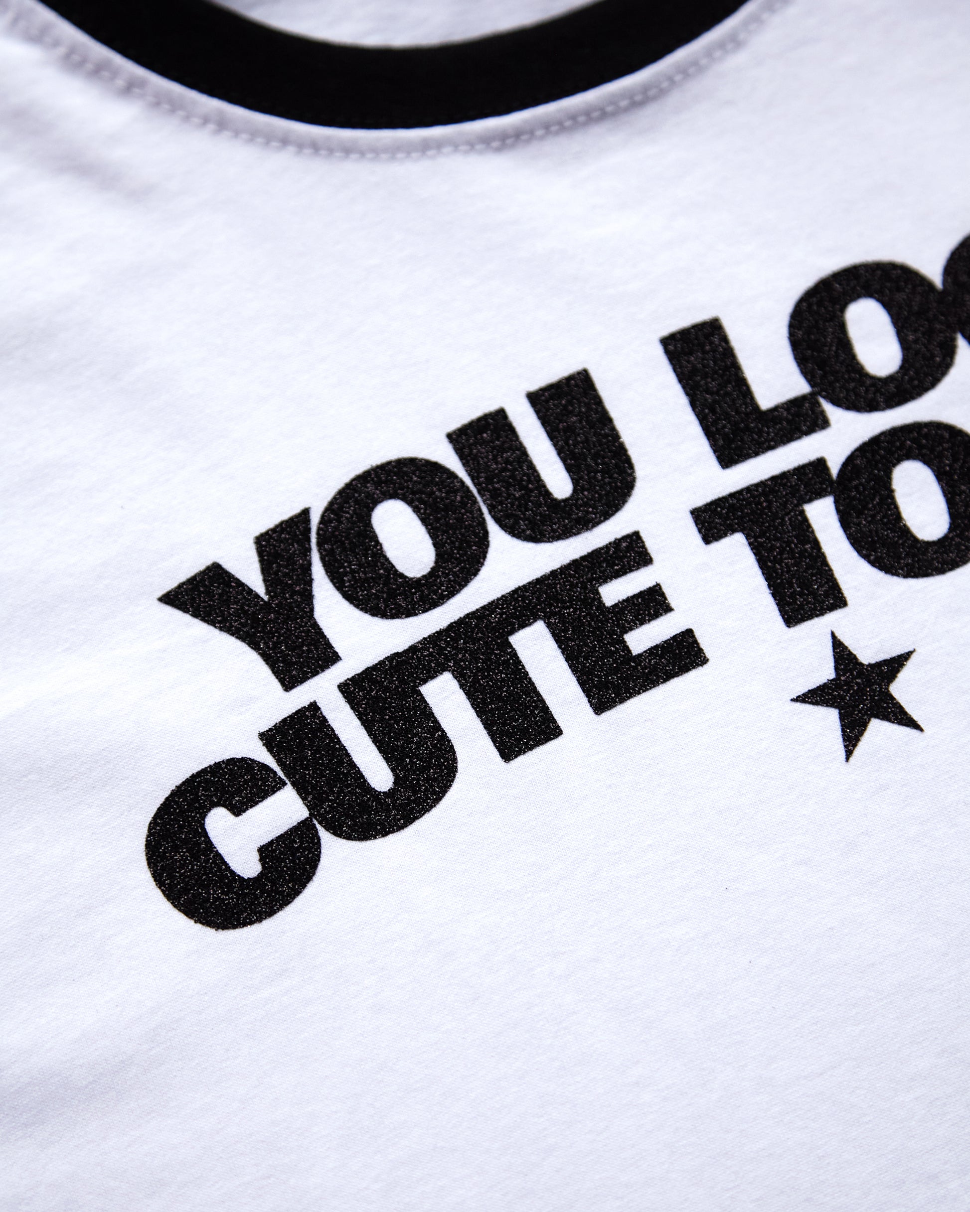 You look cute today, black glitter on black trim ringer t-shirt.