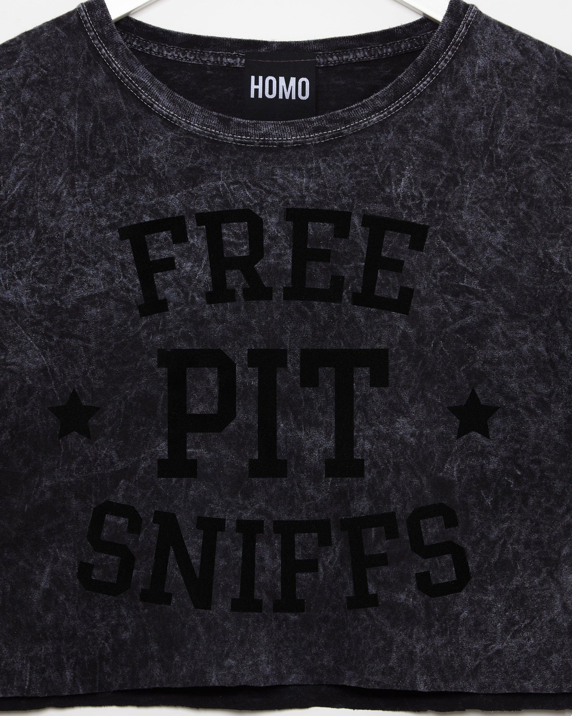 Free pit sniffs - black flock on black stone wash crop top