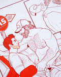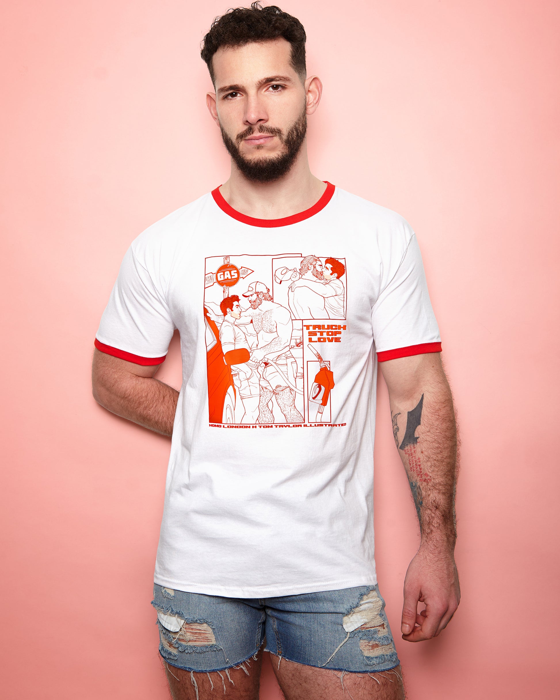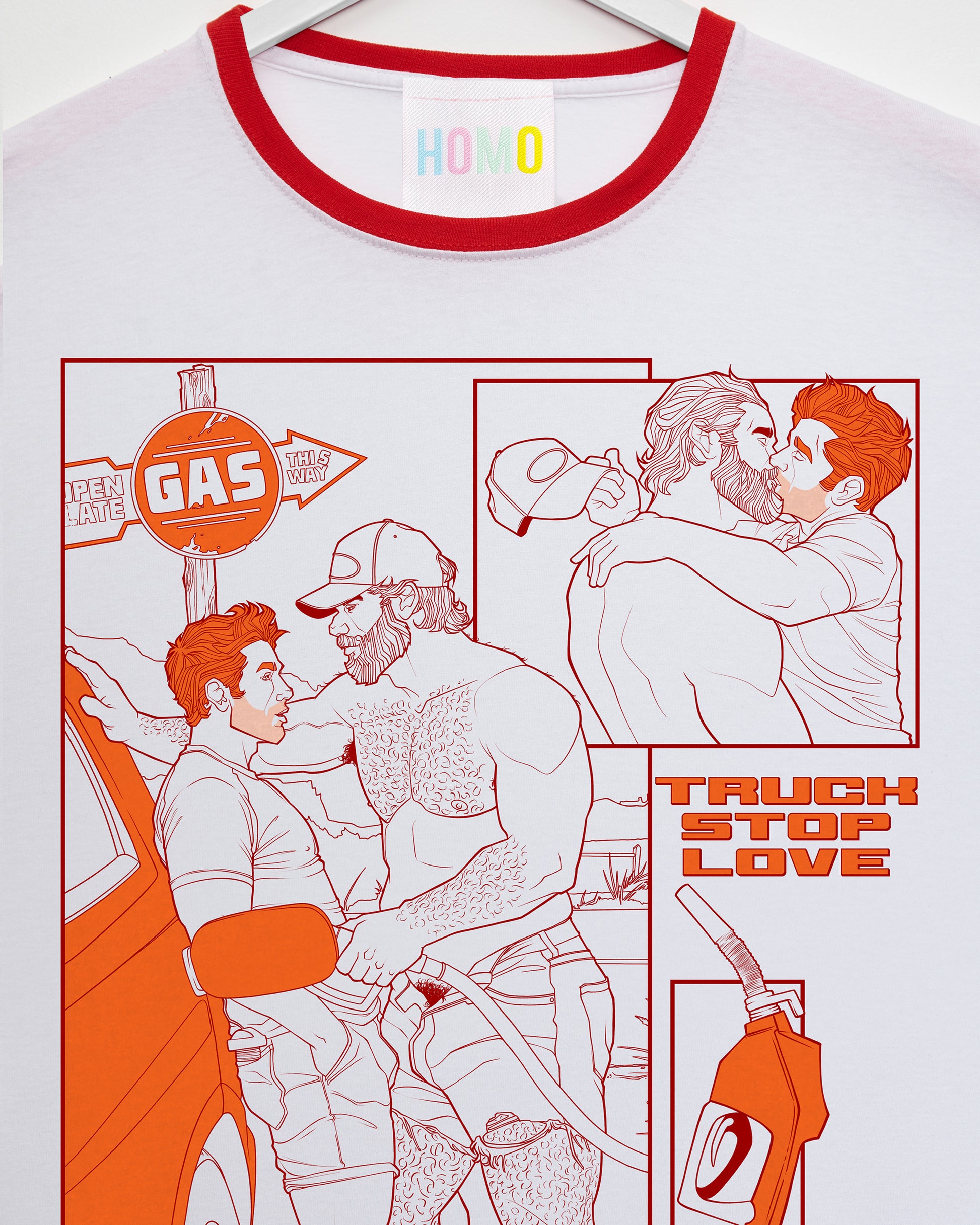 A piece that’s really close to my heart is anything with my original characters, Gage and Eli. Gage being a rugged, trucker and an all round outdoors type of guy with his counterpart Eli, a sensitive (all be it very horny) red headed twink. Soaked in old school Americana, which has become an obsession of mine ever since discovering Lana del Rey, their story started off as a sexually charged gag and soon turned into a romance story. I designed two Gage and Eli shirts, one celebrating their original meet cute at a gas station and the other a love letter to Lana’s music that really has gone on to inspire a lot of their story!