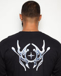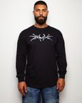 This garment features a silver style front and arm print on a long sleeve black tee.